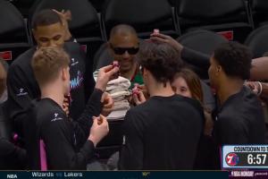 GIF-热火众将赛前“聚众”喝电解质