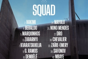 后卫:2-阿什拉夫、4-贝拉尔多、5-马尔基尼奥斯、6-扎巴尔尼、21-卢卡斯·埃尔南德斯、25-努诺·门德斯、51-帕乔
