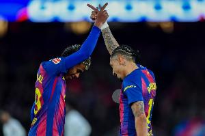 体育资讯3月16日讯 在本轮西甲巴萨对阵塞维利亚的比赛中,拉菲尼亚上演帽子戏法。