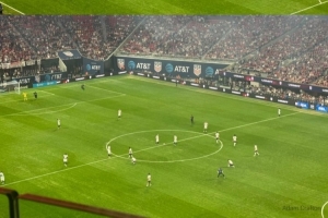 美国队在梅赛德斯-奔驰体育场进行本场比赛时,身着为今年夏天世界杯发布的新款球衣。这款球衣采用了美国国旗的色调,球衣上印有波浪状的红色和白色条纹,球衣背面则有大面积的白色区域。